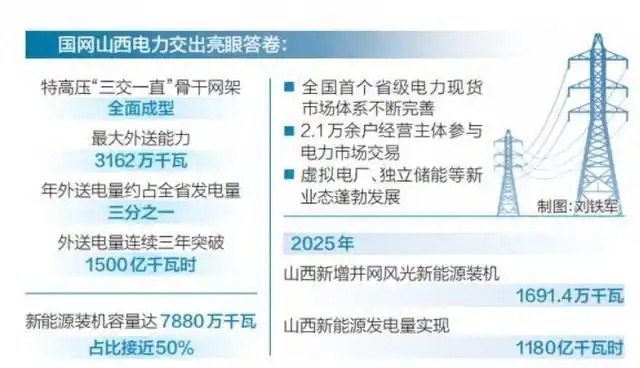 目前,山西已经形成“三交一直”特高压与14回500千伏外送通道交织的电网格局,连接华北、华东、华中三大区域。正在建设的大同—怀来—天津南1000千伏特高压交流工程,将提升外送能力600万千瓦,推动外送格局向“四交一直”升级。同时建立了“批发+零售”有序衔接、“中长期+现货”有机融合、“绿电+绿证”协同发展的完整电力市场体系,激活经营主体超2万家,为山西经济发展提供稳定电力保障和市场化动力。